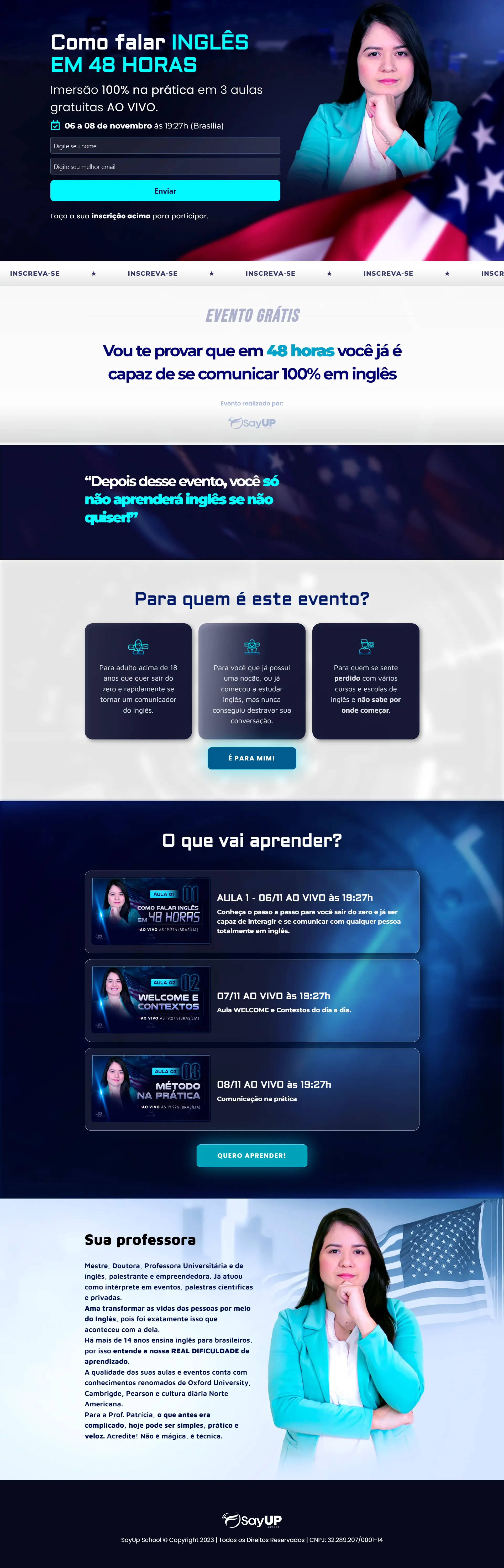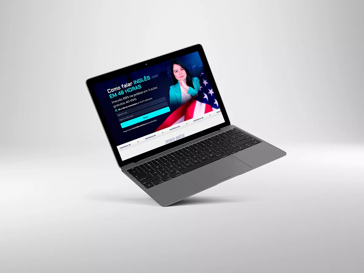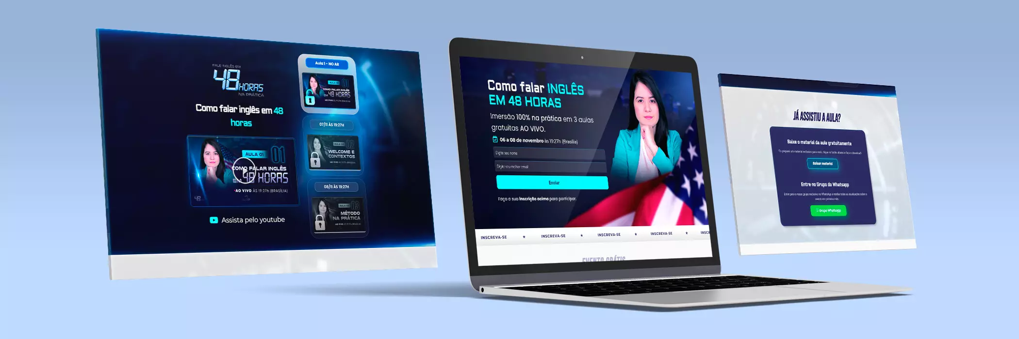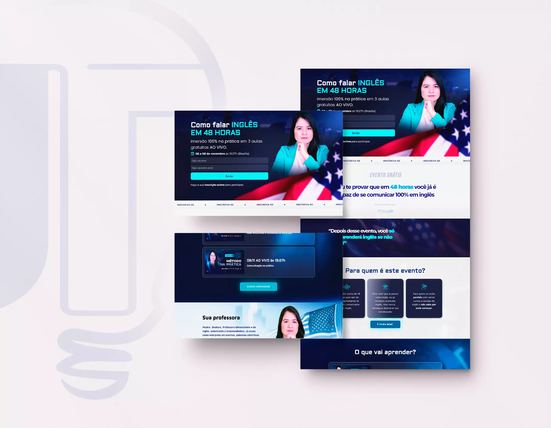A landing page e os elementos criativos foram criados com o objetivo de destacar a proposta única do evento "Fale Inglês em 48 Horas" e convencer os visitantes a se inscreverem. Utilizando elementos visuais atrativos e uma cópia persuasiva, o design visa despertar o interesse dos usuários e incentivá-los a agir.