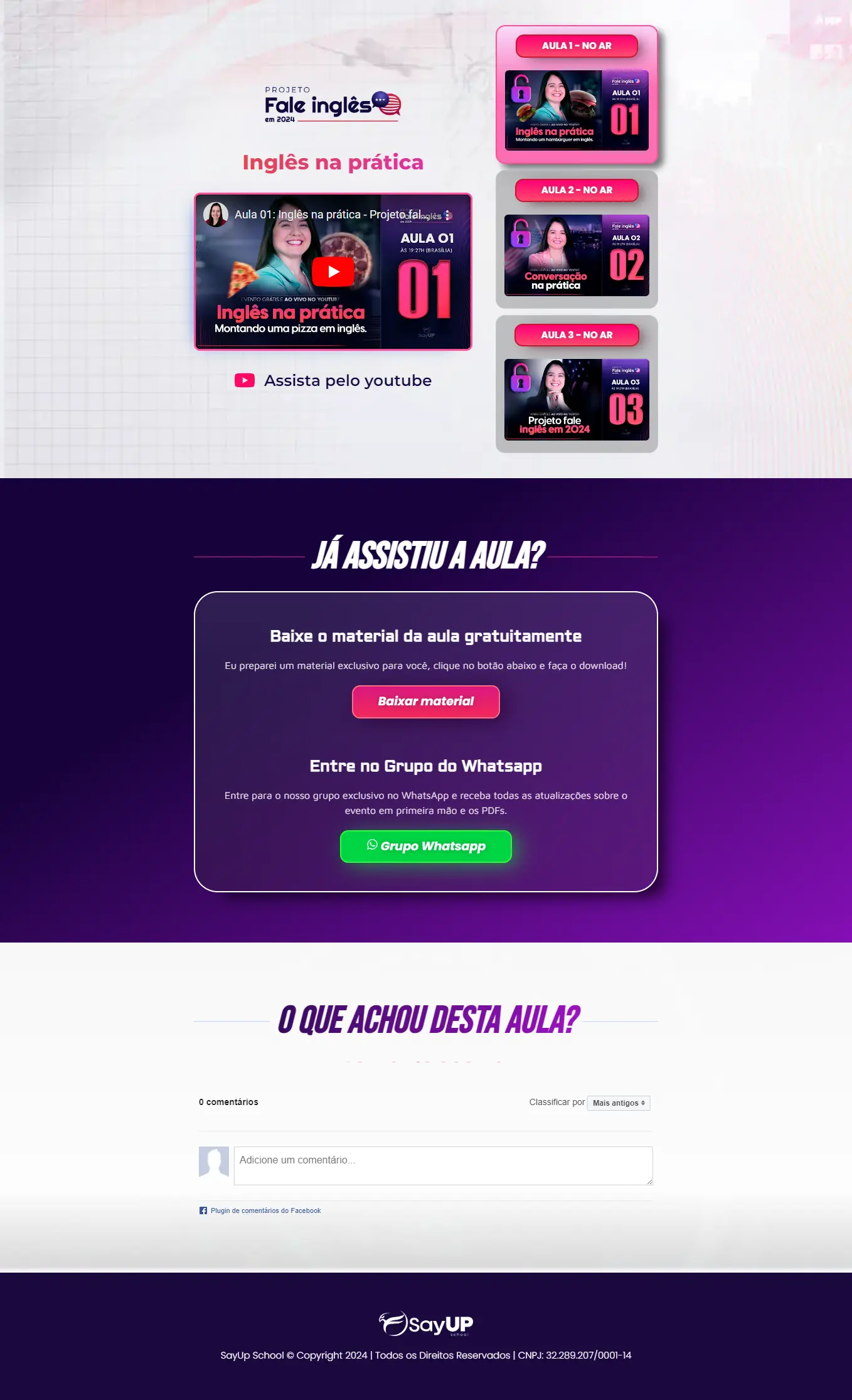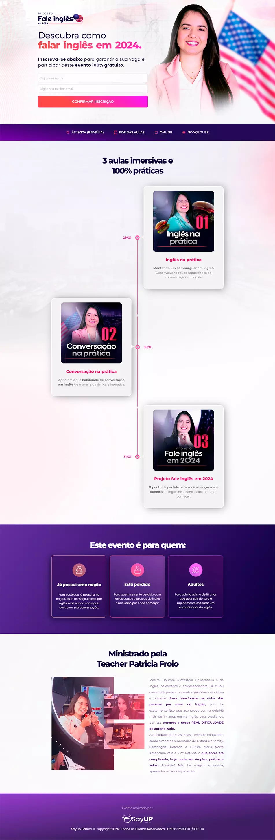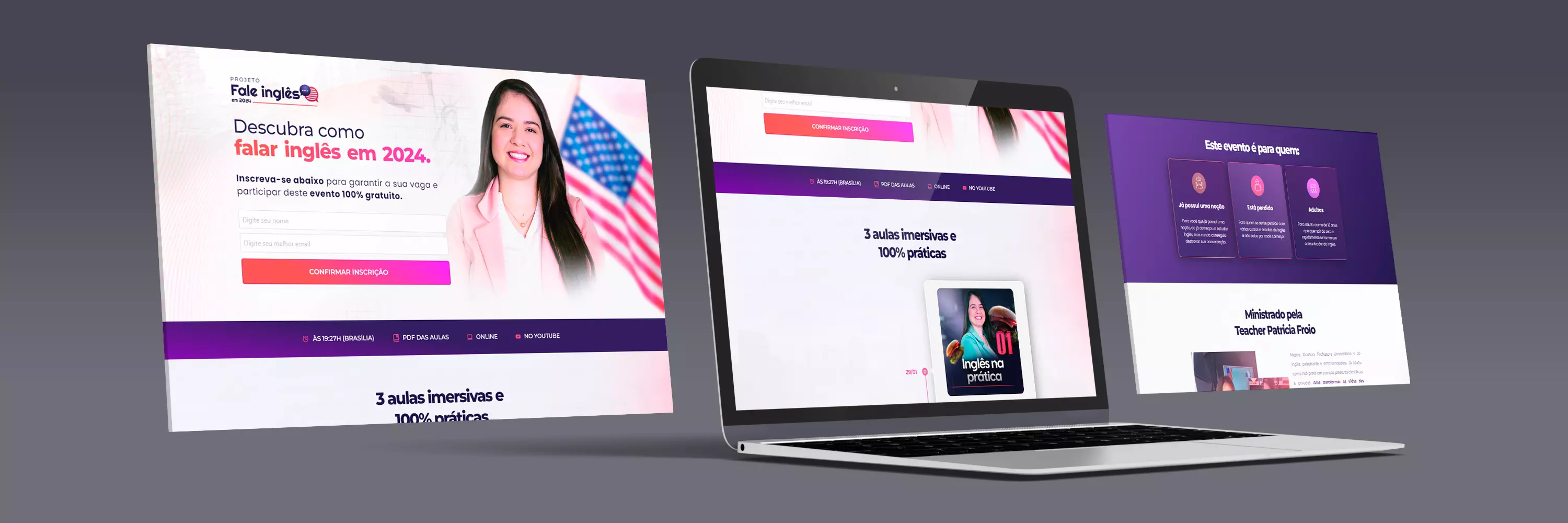 Criação da landing page para o evento online 'Fale Inglês em 2024', uma colaboração empolgante com a especialista Patricia Froio. Como parte deste projeto, fui responsável pela concepção e desenvolvimento da página, garantindo uma experiência envolvente e informativa para os visitantes. Além disso, contribuí com a criação de materiais de divulgação e chamadas inspiradoras para promover o evento.